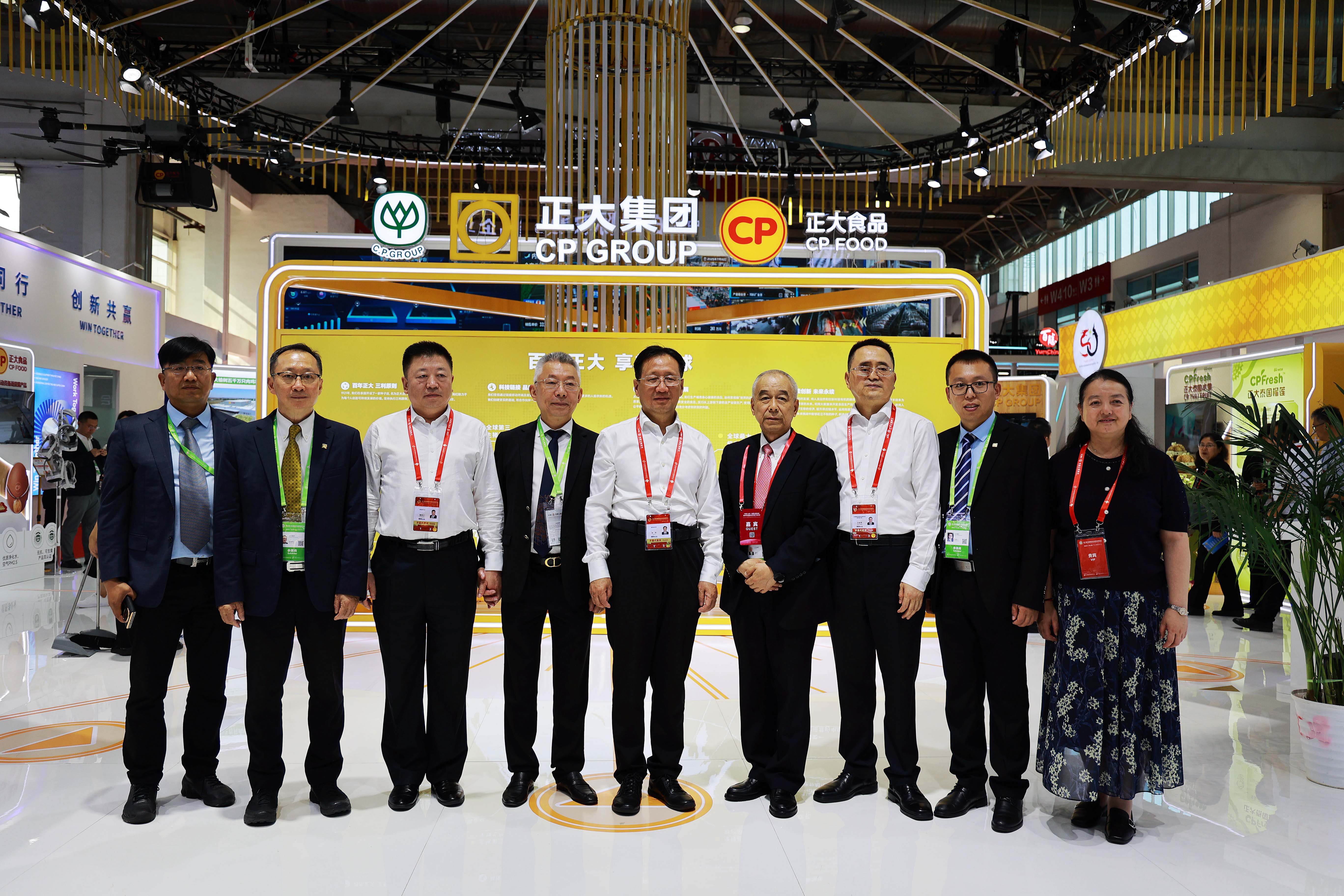 中糧集團對外合作部總監陳剛(右三)一行參觀正大展館,正大集團農牧食品企業中國區食品研發中心總裁王冶(右二)、王恩川副總裁(左三)、正大北京戰區市場部總監周賀(左二)等熱情接待來賓并合影留念。