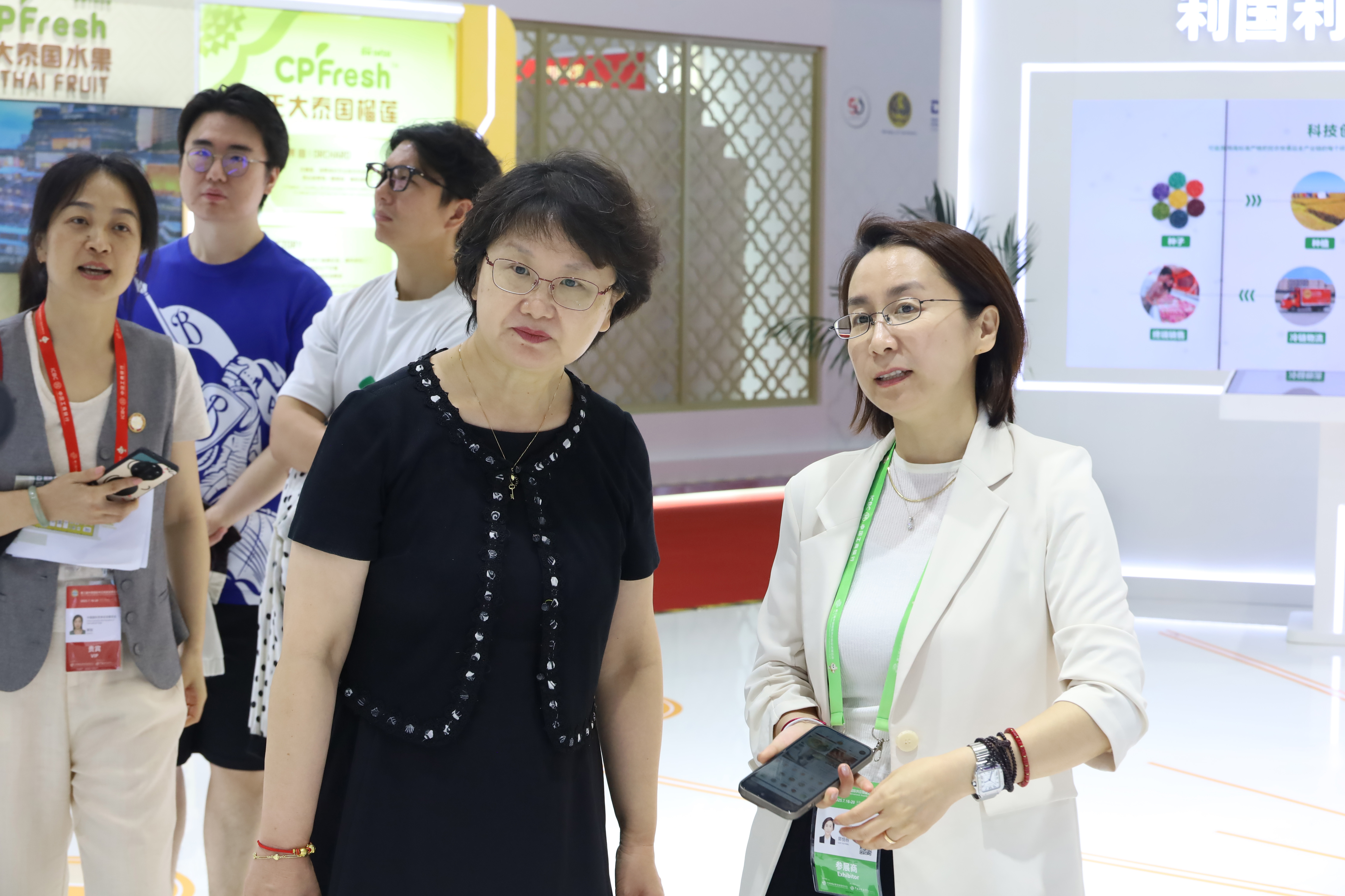 商務部歐亞司一行參觀正大展館,正大集團農牧食品企業中國區市場中心品牌傳播總監郭悅楊(右)熱情接待來賓。