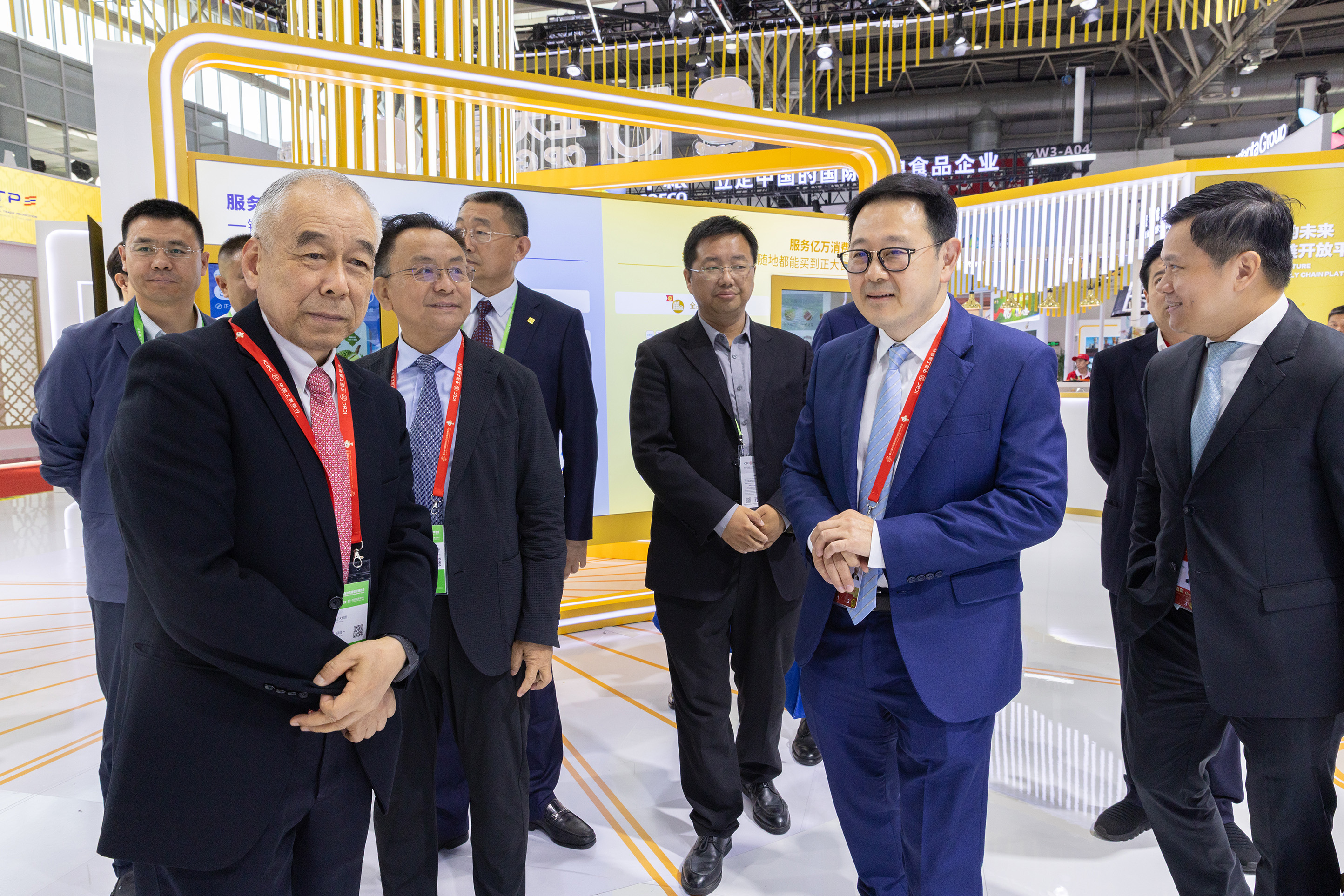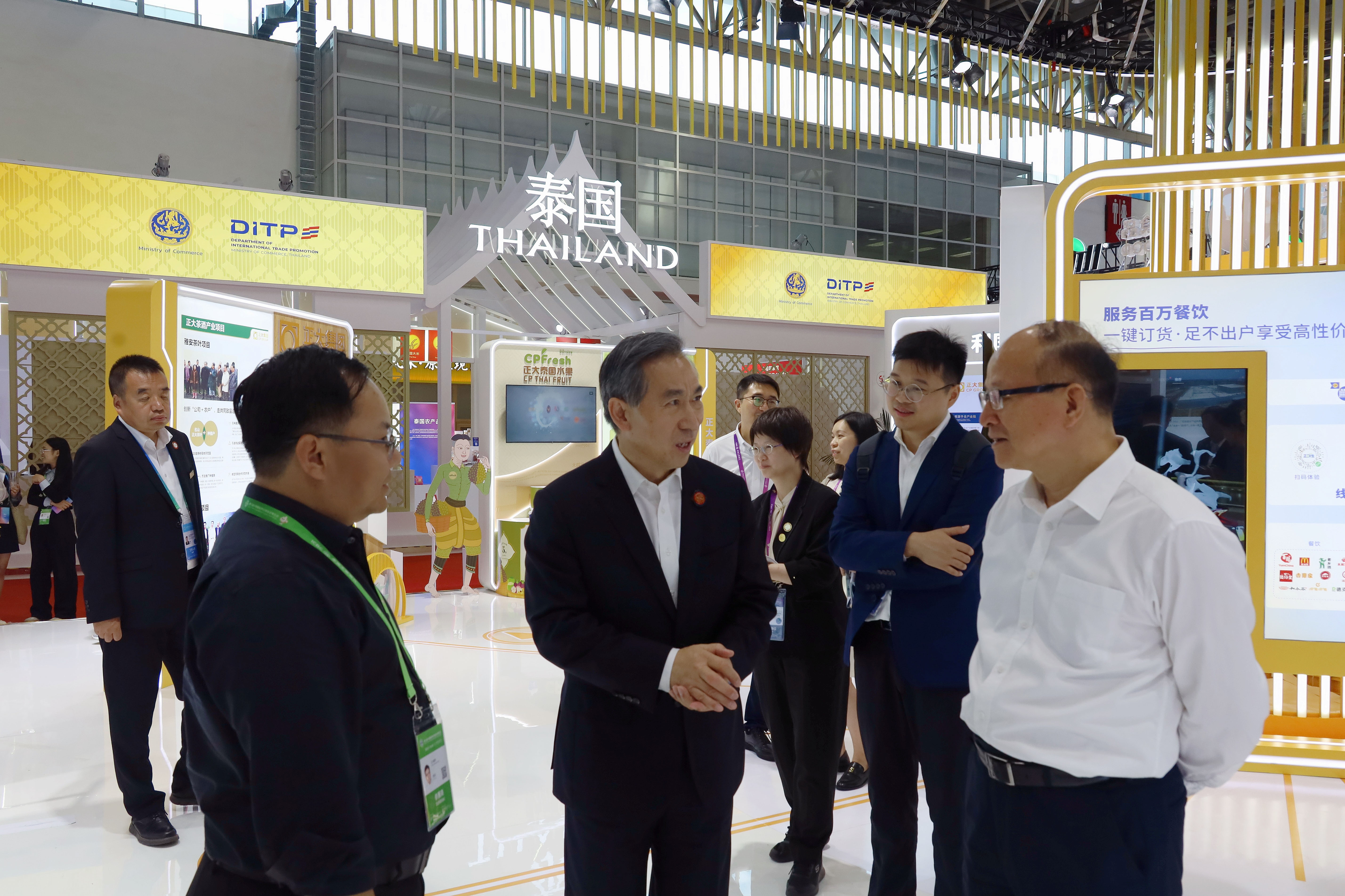 中國貿促會會長任鴻斌(中)、副會長陳建安(右一)一行參觀正大展館,正大集團農牧食品企業中國區市場中心市場活動總監楊帆(左一)熱情接待來賓。任鴻斌會長高度評價正大展館,他表示,正大集團本屆參展效果突出,生態樹設計深度契合鏈博會主題??疾煺髢让晒虐偃f頭生豬養殖項目展區時,他還特別稱贊:“正大全產業鏈食材品質卓越。”
